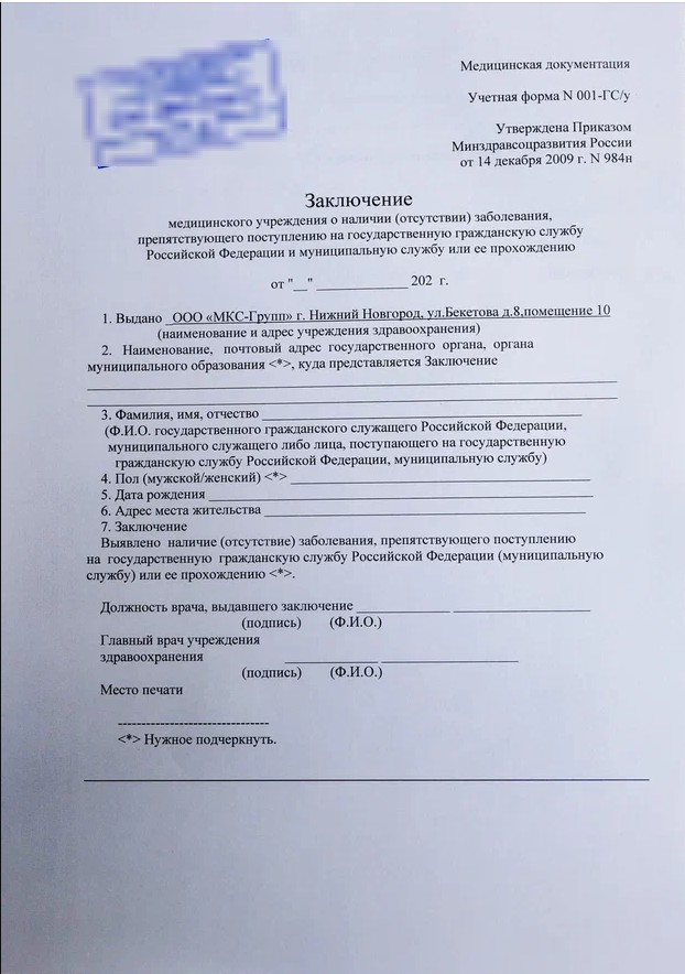 Cправка 001 ГС/у для госслужбы в Нижнем Новгороде